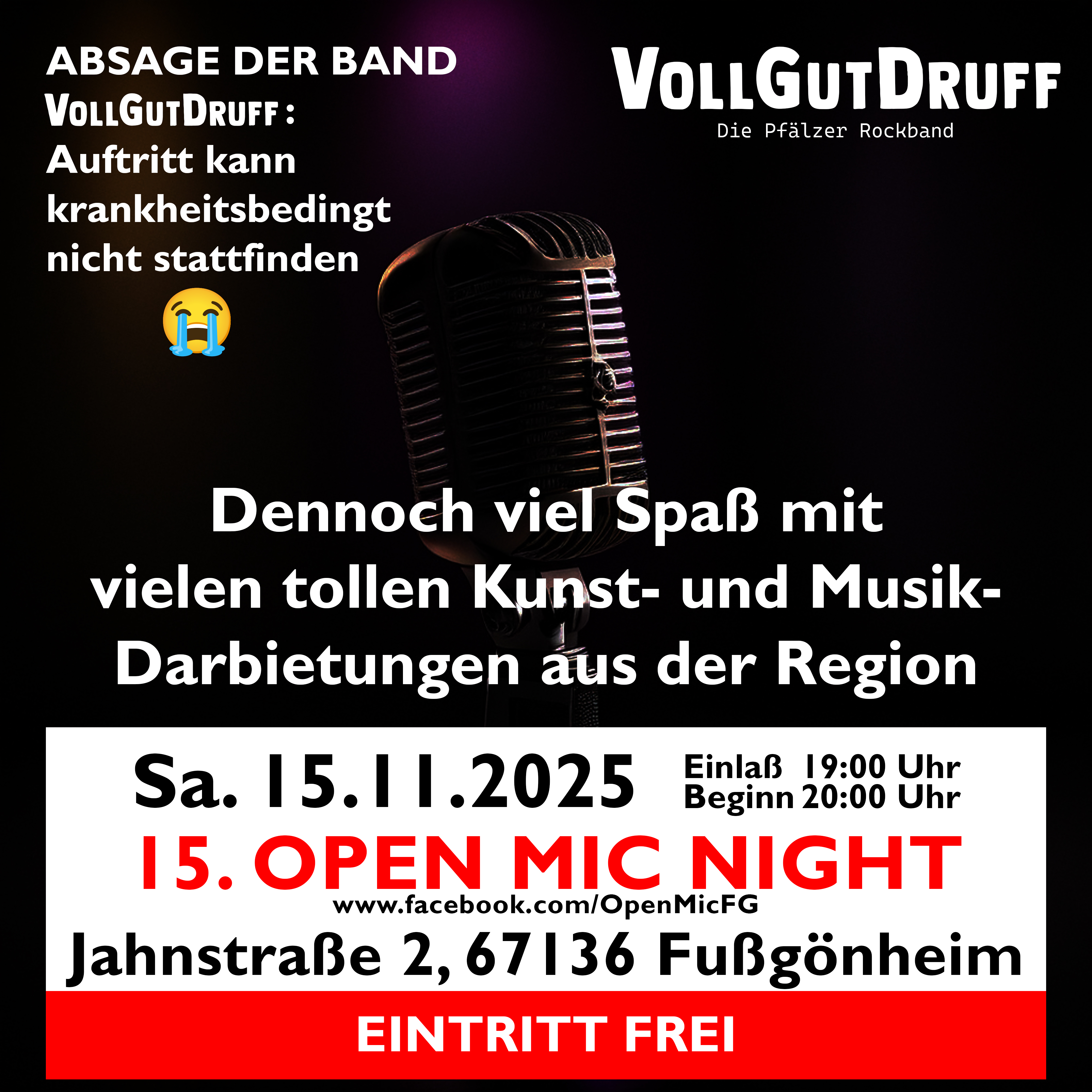 | Beitrag vom Freitag, 14.11.2025 🥃 Wichtige – und leicht traurige – Mitteilung der VGDs 😢 Liebe Open Mic-Freunde, wir müssen euch leider mitteilen, dass wir, eure VGDs, am Samstag krankheitsbedingt nicht am Start sein können. Es hat uns kurzfristig erwischt und wir können den Proberaum leider noch nicht verlassen. Wir sind gerade voll traurig "druff", dass unser Auftritt bei der 15. legendären Open Mic Night in Fußgönheim ausfällt. Achtung, jetzt kommt die gute Nachricht: Das Event steigt trotzdem! Ab 19:00 Uhr öffnen sich die Tore und ab 20:00 Uhr geht das fantastische kulturelle Programm mit vielen anderen großartigen Kunst- und Musikdarbietungen aus der Region los. Daher unsere Bitte: Lasst euch den Abend nicht verderben! Nehmt euch den ganzen Abend frei, genießt das bunte Programm, das das Open Mic-Team Fußgönheim für euch zusammengestellt hat, und supportet die anderen Acts! Das ehrenamtliche Team freut sich auf euch alle. Bringt deren Kassen zum Überlaufen und leert die Kühlschränke – wir sind in Gedanken (und beim nächsten Mal wieder live) dabei! Wir sehen uns hoffentlich beim nächsten Mal! Eure VGDs 🥃🥛🥛🥃 #vollgutdruff #vgd #pfälzer #rockband #live #goodvibes #diepfälzerrockband #pfalz #schön #lebendig #echt #dialekt #lebensgefühl #entbindung #event #party #livevent #veranstaltung |