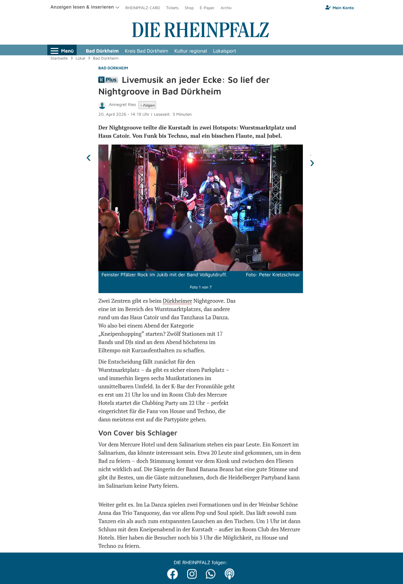 | Beitrag vom Donnerstag, 23.04.2026 UND DIREKT DER NÄCHSTE KNALLER! 📰🔥 WIR SIND AUCH IN DER RHEINPFALZ! Leute, es reißt einfach nicht ab! Nachdem wir uns über den Wochenblatt-Bericht schon riesig gefreut haben, flattert direkt der nächste Artikel rein. Diesmal war DIE RHEINPFALZ beim Nightgroove in Bad Dürkheim unterwegs und hat vorbeigeschaut. Und was sollen wir sagen? Wenn unter unserem Foto direkt als Bildunterschrift „Feinster Pfälzer Rock im JuKiB mit der Band VollGutDruff“ steht, dann geht uns einfach das Herz auf! ❤️🎸 Genau so muss das sein! Ein fettes Dankeschön an den Fotografen Peter Kretzschmar für diesen genialen Schnappschuss mitten aus der Menge und an die Redaktion für den Bericht. Den Link zum Artikel haben wir euch hier reingepackt (Achtung: Es handelt sich um einen RHEINPFALZ Plus-Artikel): 👉 www.rheinpfalz.de/bad-duerkheim_artikel-livemusik-an-jeder-ecke.html Damit ihr auch ohne Abo seht, wovon wir reden, haben wir euch den Screenshot direkt mal in Bildform angehängt! 😉 Wir stoßen auf euch (und auf feinsten Pfälzer Rock) an! Eure Jungs von VollGutDruff | Eure VGDs 🥃🥛🥛🥃 ![]() #VollGutDruff #Nightgroove #BadDürkheim #LiveMusic #Danke #RocknRoll #JuKiB #vgd #pfälzer #rockband #live #goodvibes #diepfälzerrockband #pfalz #schön #lebendig #echt #dialekt #lebensgefühl #event #party #livevent #veranstaltung |